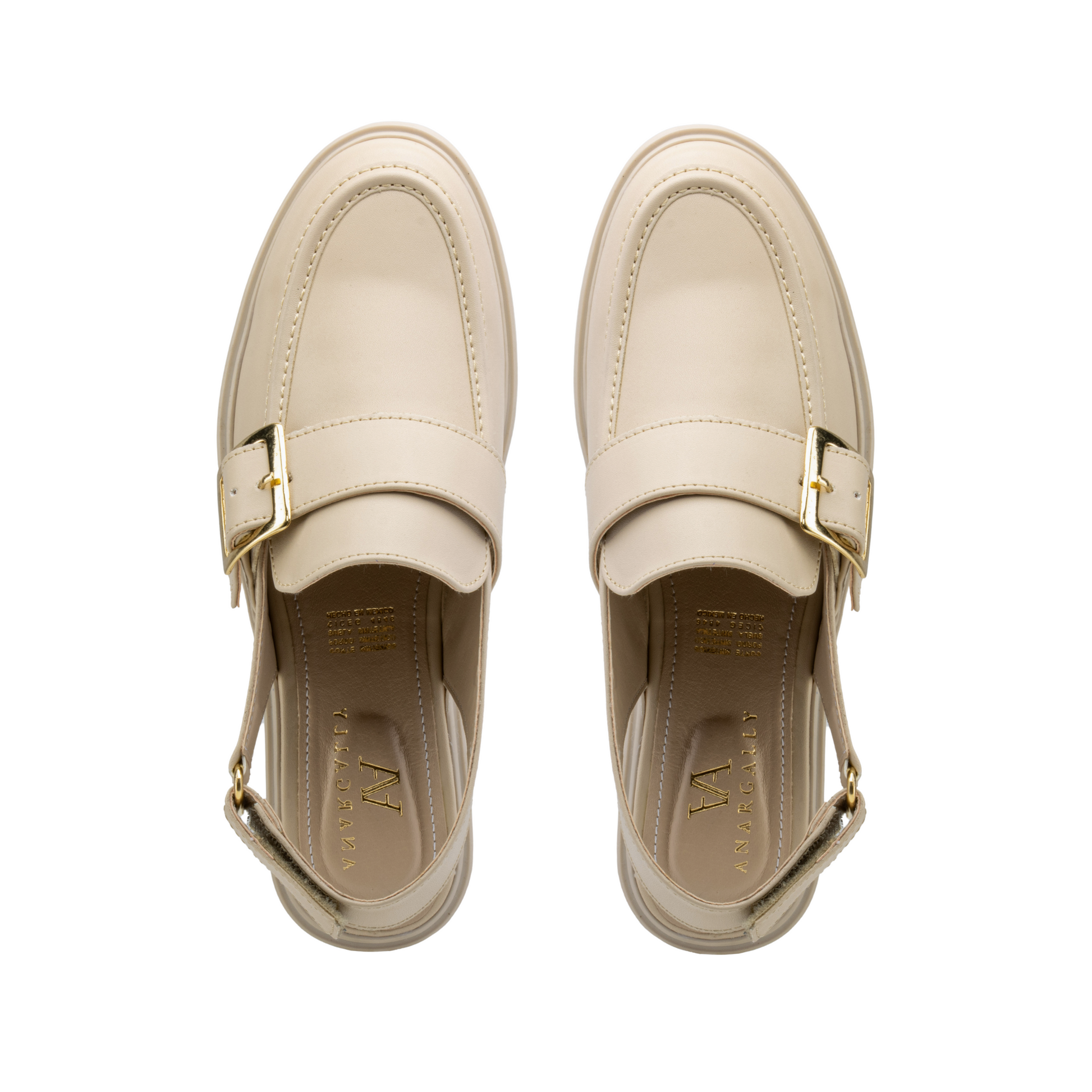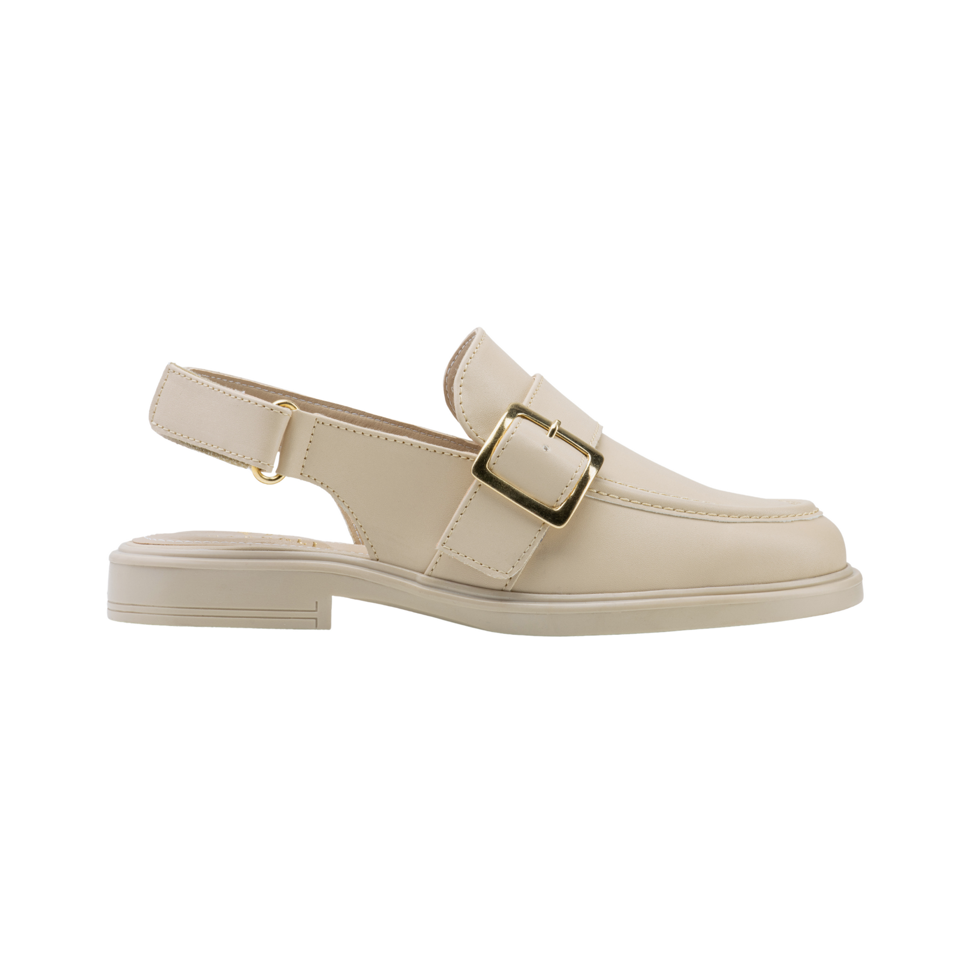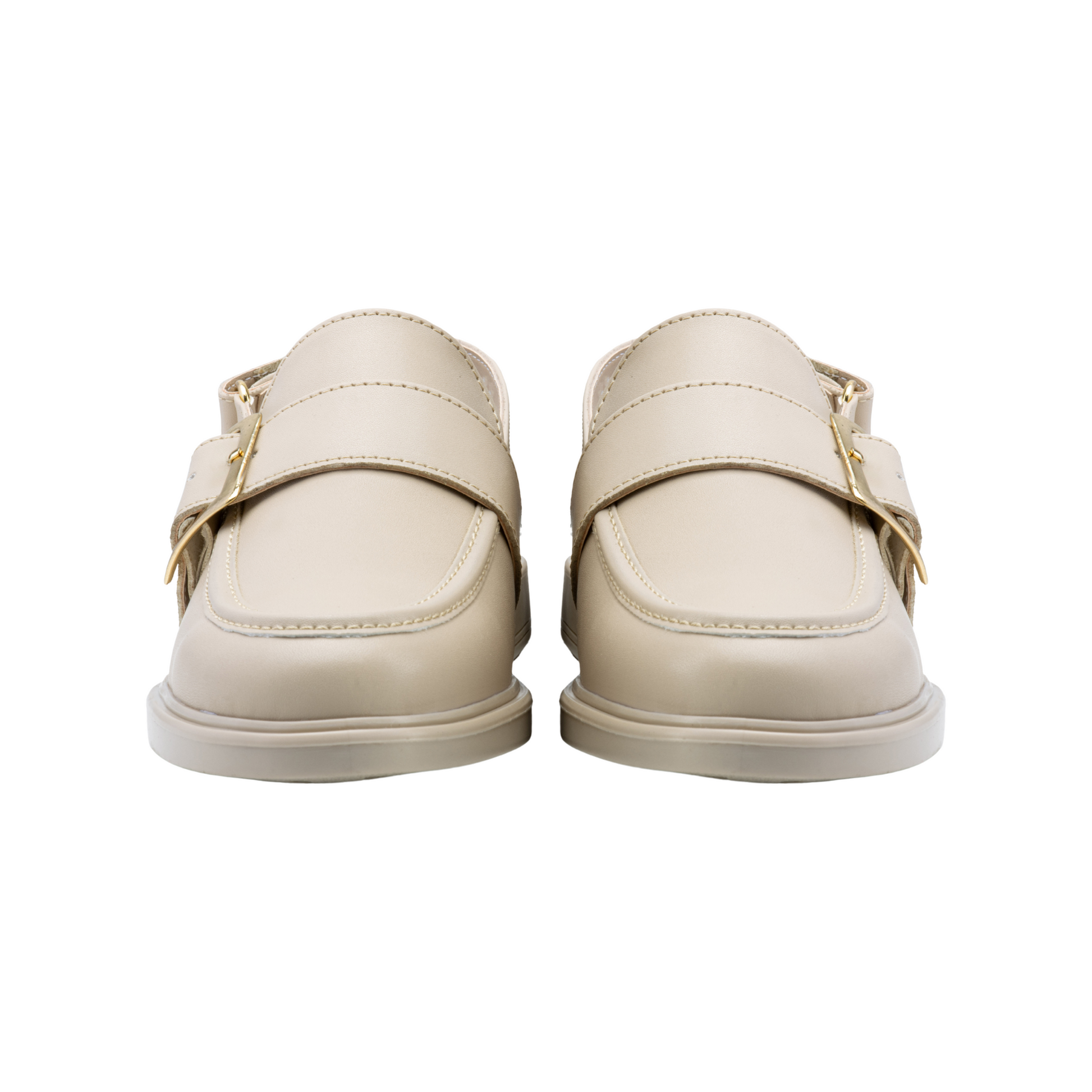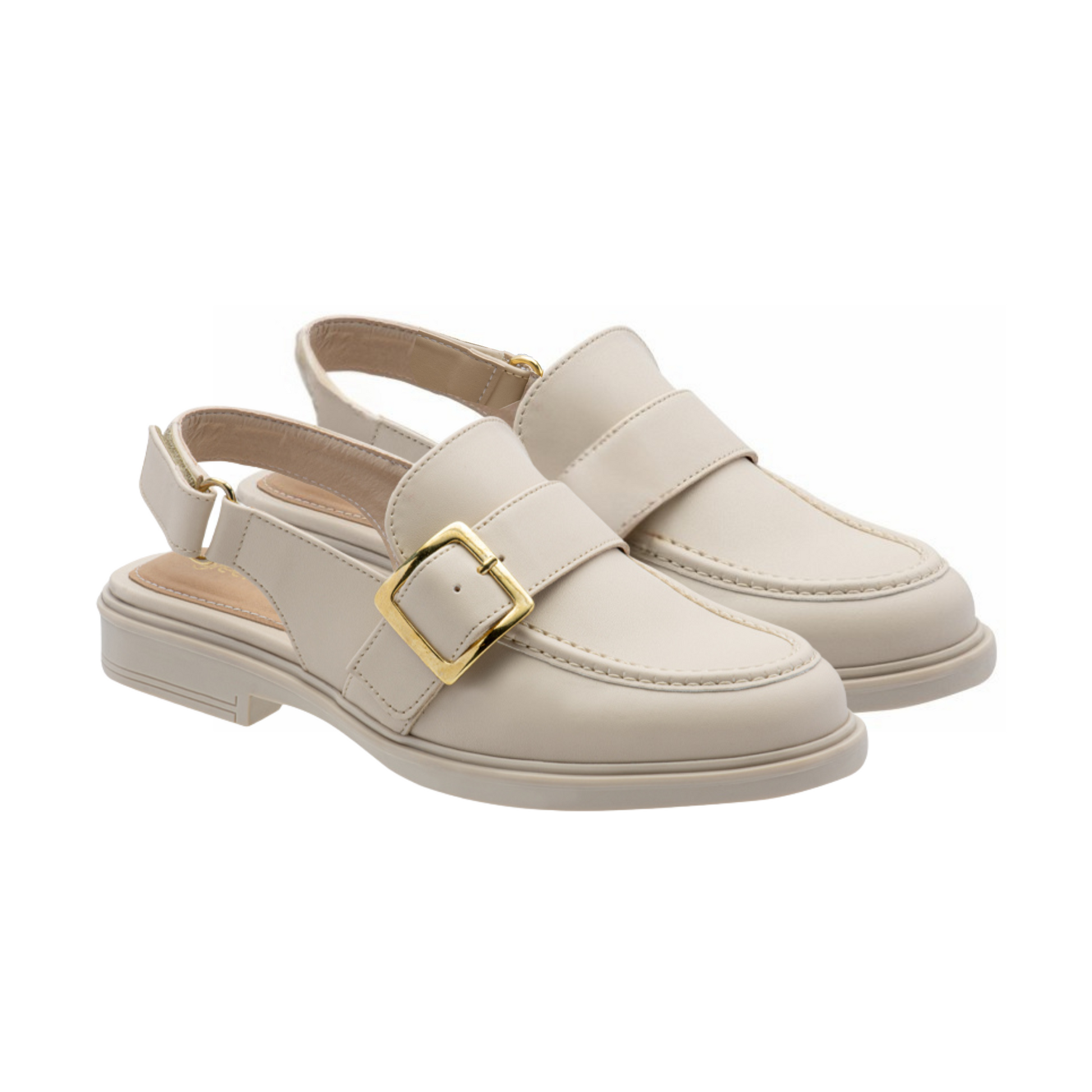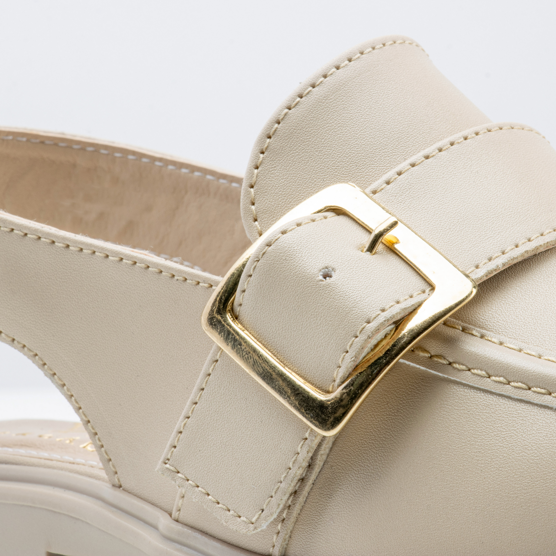 El modelo DAFNE está hecho de piel sintética de alta calidad en un elegante tono color avena. Su diseño minimalista y sofisticado lo hace perfecto para cualquier ocasión. Gracias a su suela baja y plana con mini tacón de 1.5 cm ofrece comodidad durante todo el día.