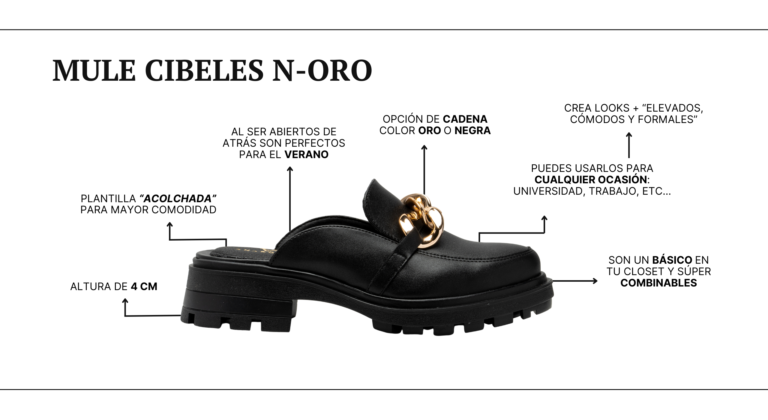 El modelo CIBELES color negro esta hecho de piel sintética de alta calidad. Su diseño en tendencia que lo vuelve ÚNICO y MODERNO, son ideales para elevar cualquier outfit, además de que son súper cómodos por su plantilla de eva y súper combinables.